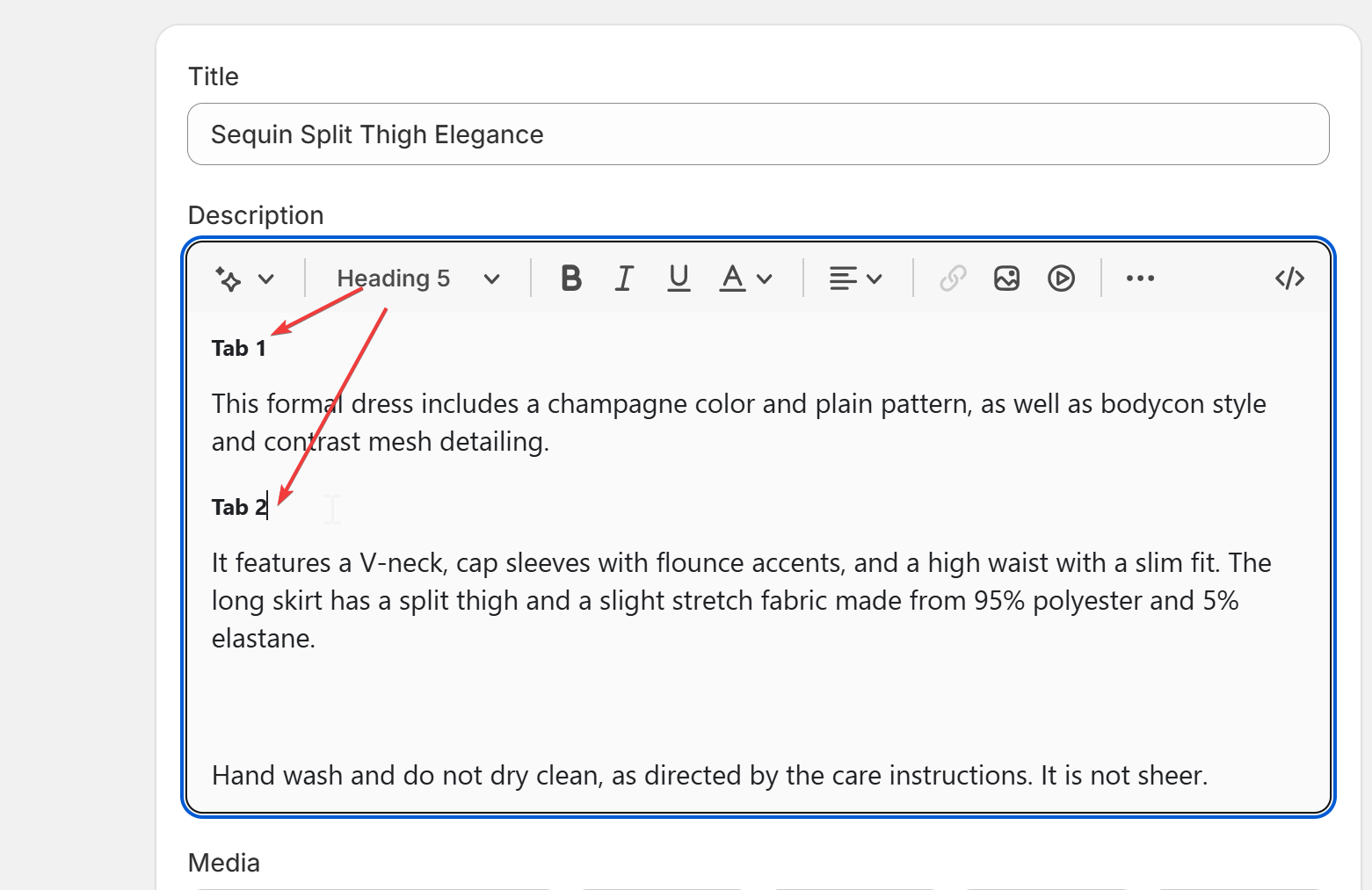 - Write with Purpose: In your product description field, assign the chosen heading size (e.g., Heading 1) to each section title that you wish to become a tab. This could include sections like “Features,” “Materials & Care,” “Dimensions,” or “Customer Reviews.”
